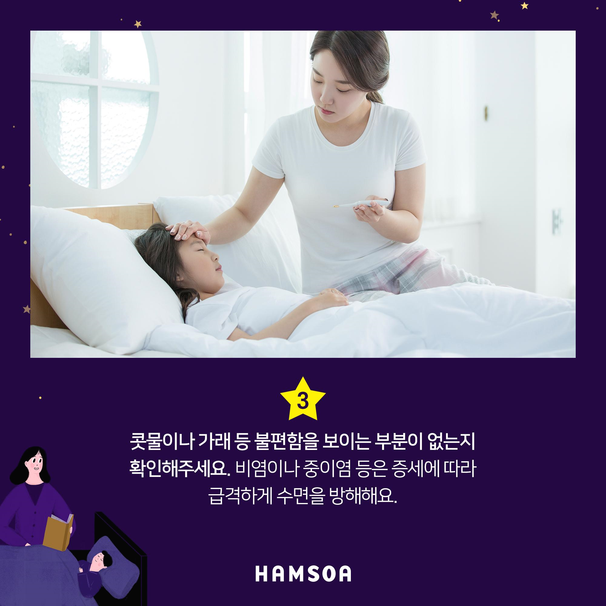 숙면을 위한 생활관리법 #3. 콧물이나 가래 등 불편함을 보이는 부분이 없는지 확인해주세요.