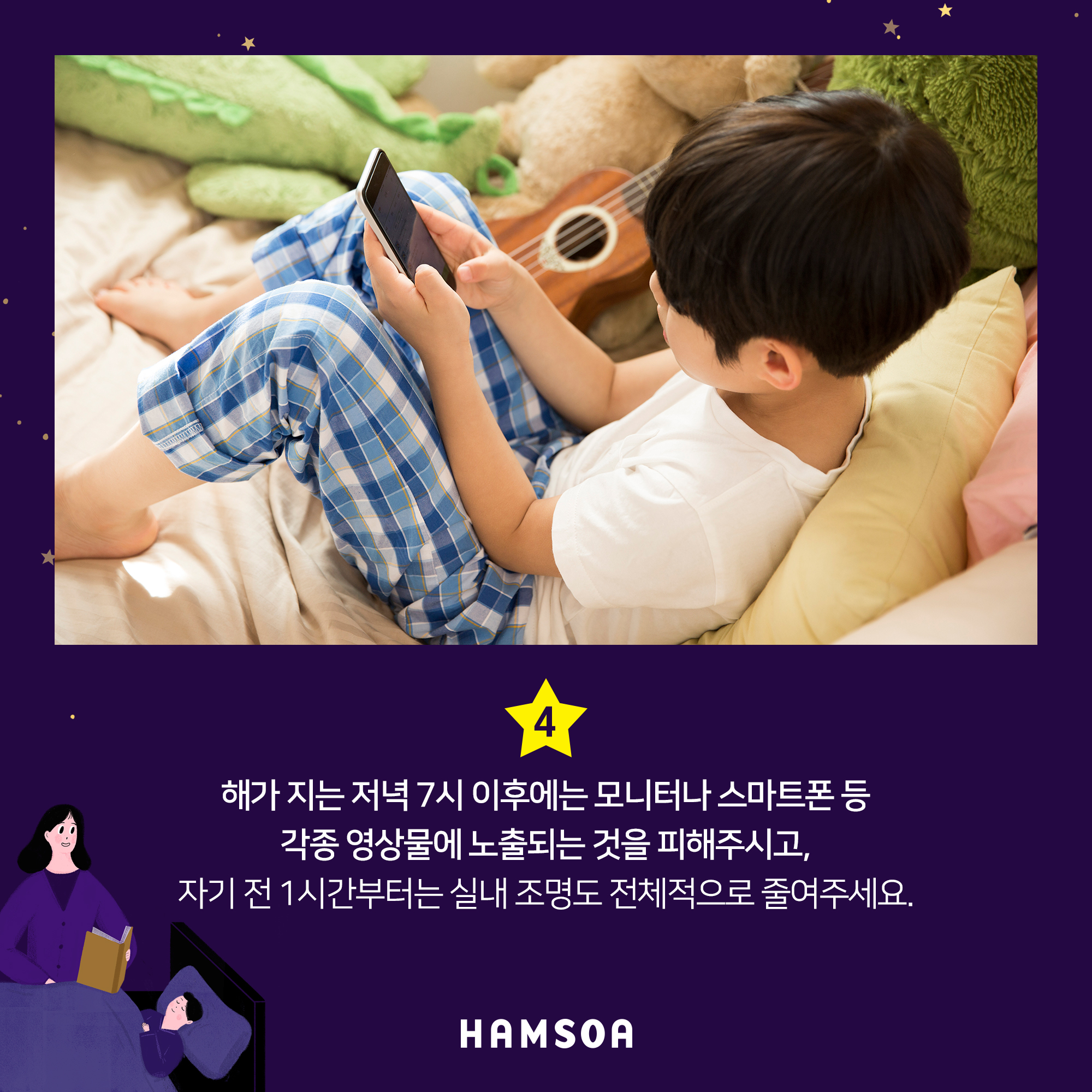 저녁부터 모니터나 스마트폰 등 각종 영상에 노출되지 않도록 도와 주시고, 자기 1시간 전부터는 실내조명도 전체적으로 줄여서 숙면 분위기를 만들어 주는 것이 좋습니다.