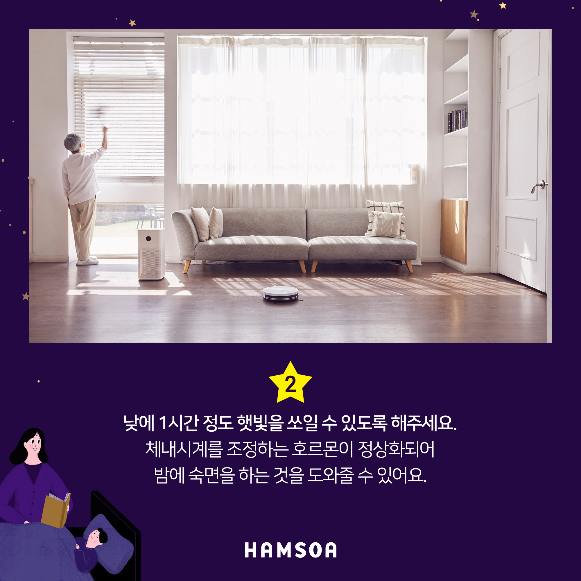 숙면을 위한 생활관리법 #2. 낮에 1시간 정도 햇빛에 노출 될 수 있도록 해주세요.