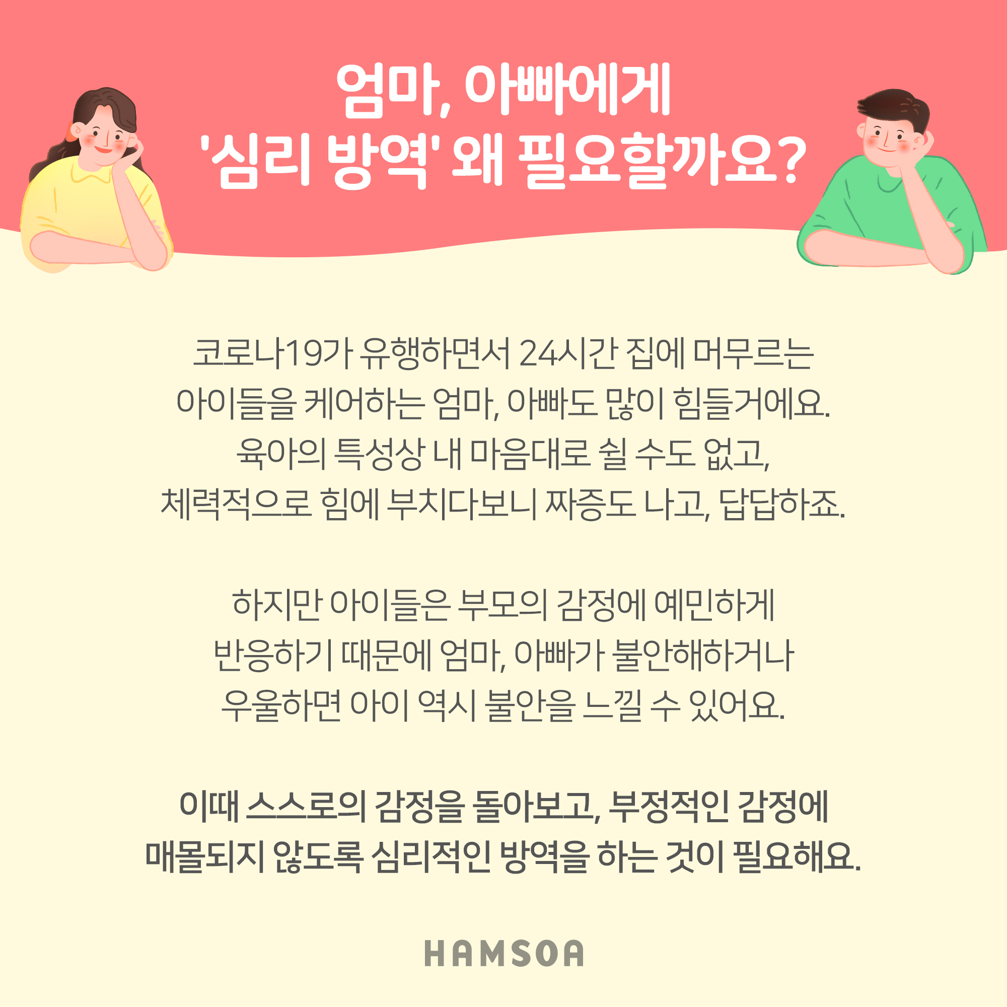 오늘은 사회적 거리두기 만큼 중요한 엄마와 아빠의 심리방역에 대해 함께 알아보려고 합니다.