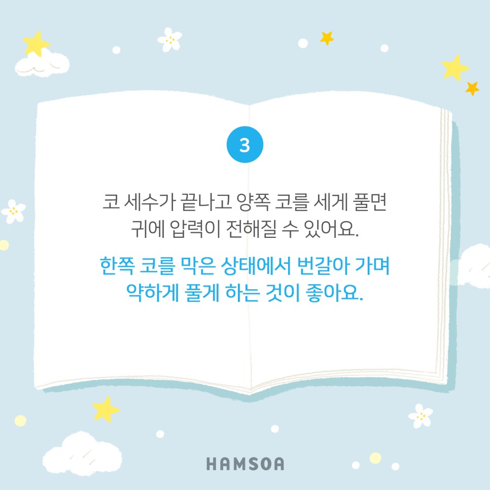 코 세수가 끝나고 양쪽 코를 세게 풀면 귀에 압력이 전해질 수 있습니다.