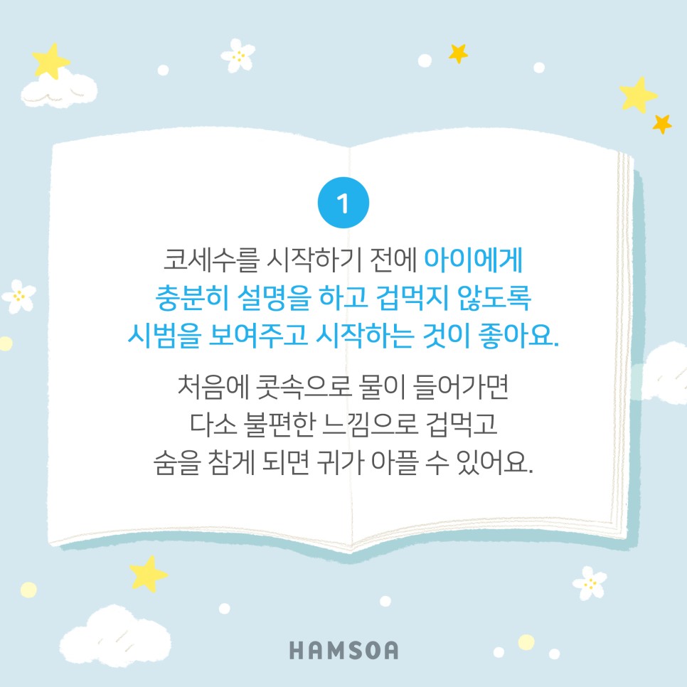 코 세수를 하기 전에 아이에게 충분히 설명을 하고 무서워하지 않도록