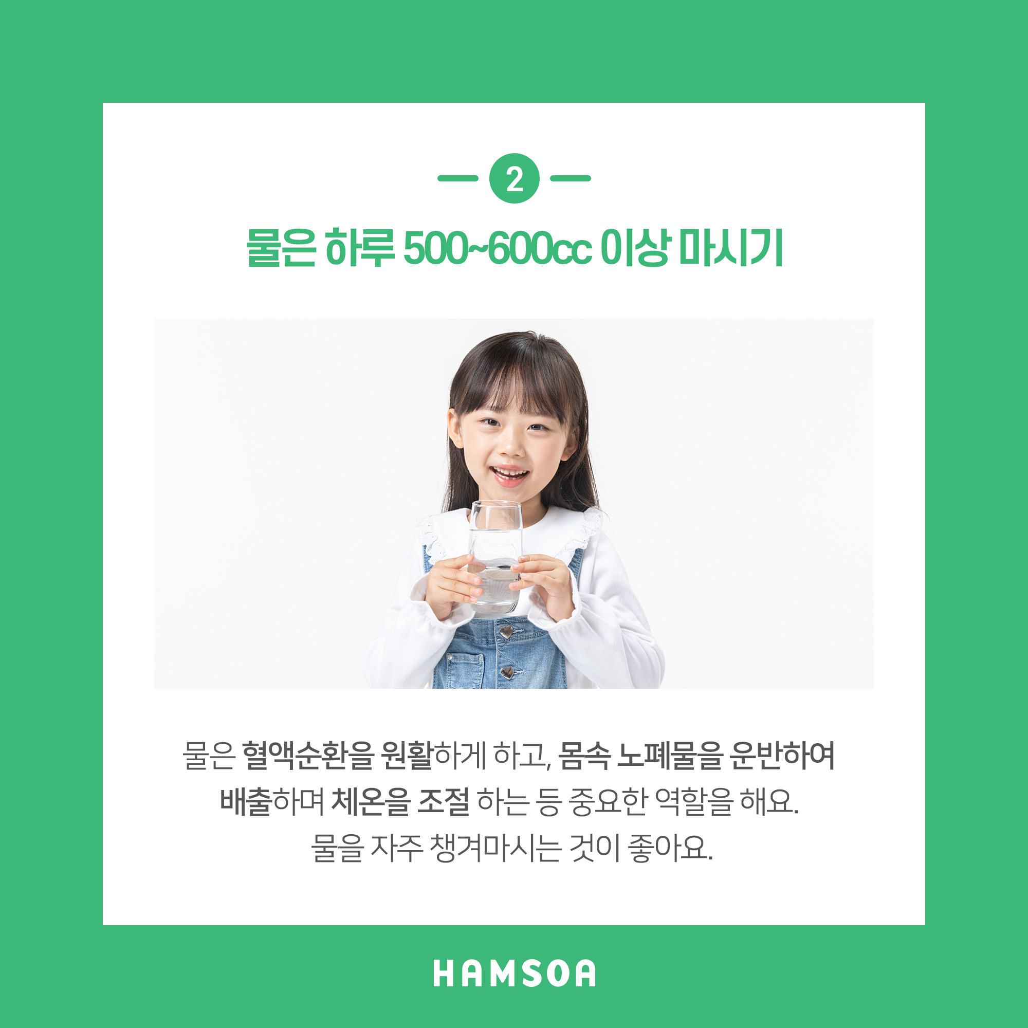 2.물은 하루 500~600cc 이상 챙겨주세요.