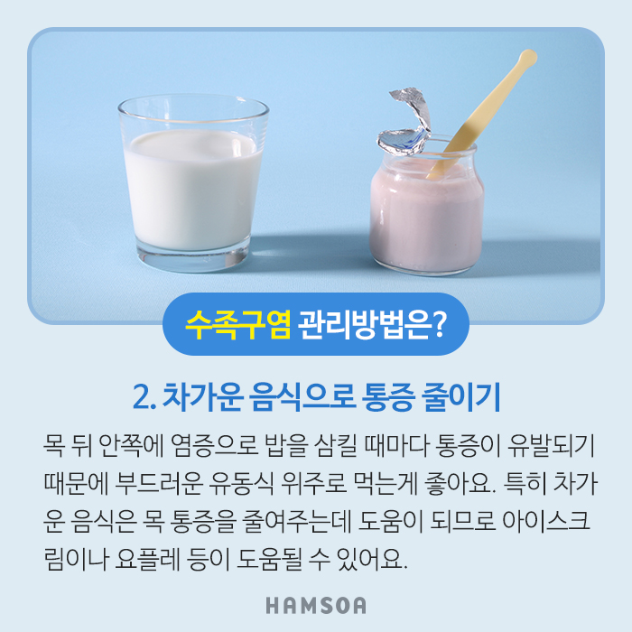 특히 차가운 음식은 목 통증을 줄여주는데 도움이 되므로 아이스크림 등이 도움 될 수 있습니다.
