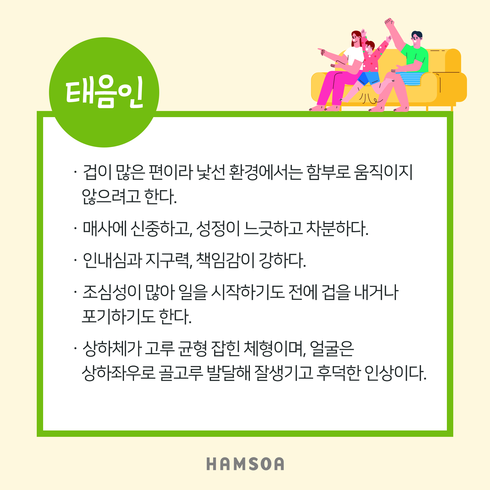 ▶ 환경을 거의 의식하지 않고 낯가림이 별로 없어 처음 만난 사람도 쉽게 사귄다.