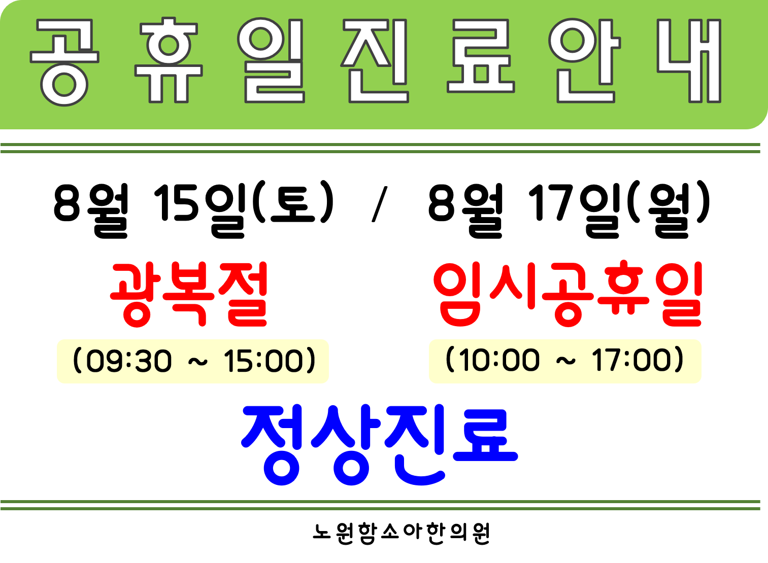 8월 15일(토) 광복절 / 8월 17일(월) 임시공휴일 진료 일정 안내해드려요 ~~