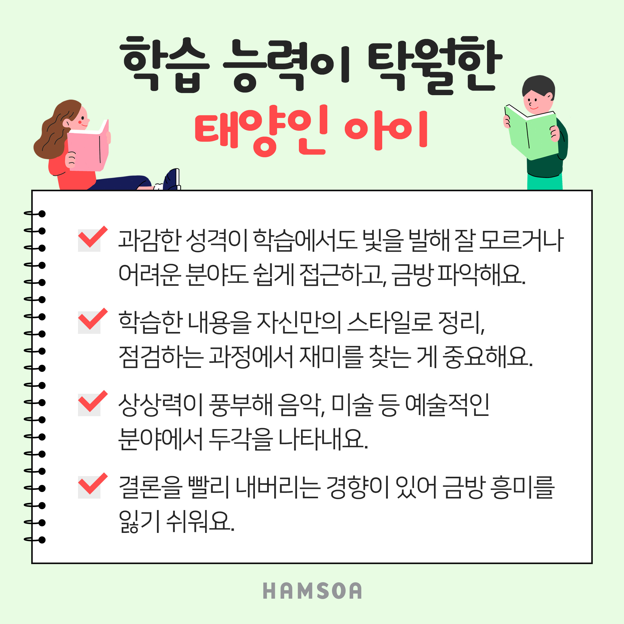 - 과감한 성격이 학습에서도 영향을 주어 어려운 분야도 쉽게 접근하고, 금방 파악합니다.