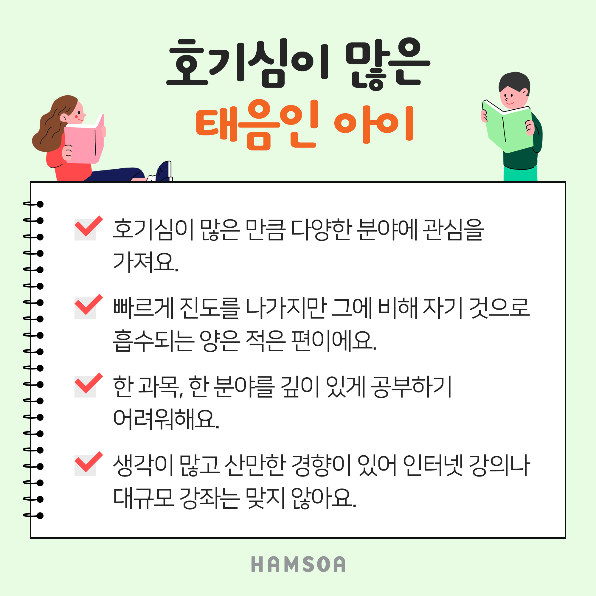 - 생각이 많고 산만한 경향이 있어 인터넷 강의나 대규모 강좌는 맞지 않습니다.