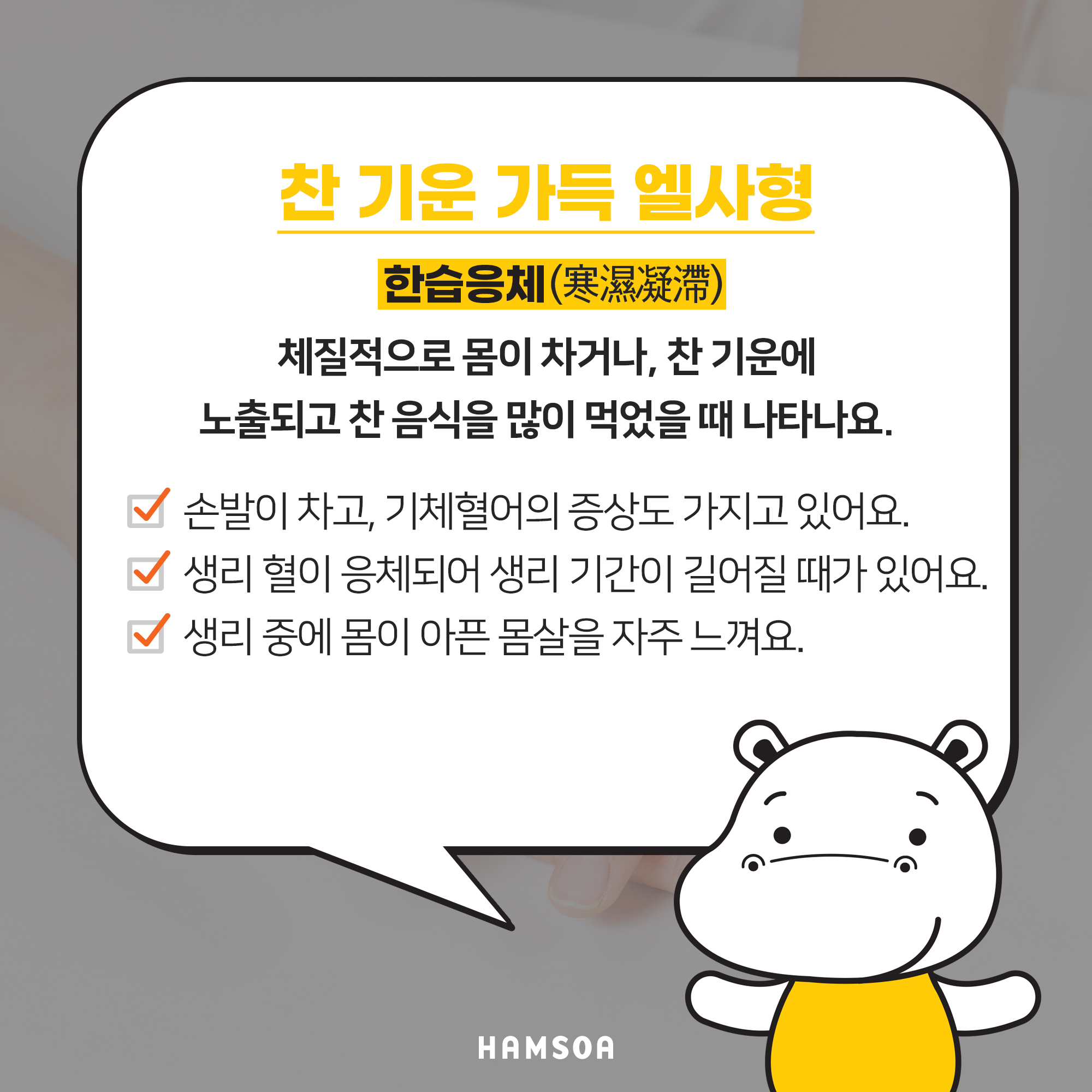 ▶ 손발이 차고, 기체혈어의 증상도 가지고 있어요.