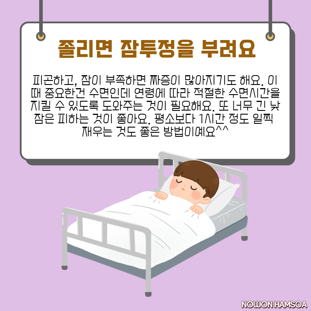 평소 잠투정이 없던 아이인데, 노권상으로 잠투정이 생기고, 짜증이 많아지거나 했을 때 잠 자는 습관을 한번 돌아봐주세요. 넘 낮잠을 길게 자는 것은 아닌지... 아이들이 기력이 약해지면서 잠 드는 것 자체를 힘들어 하는 경우도 있습니다.