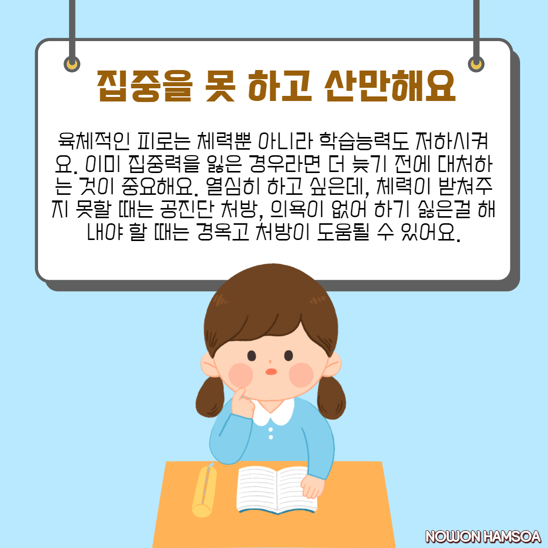 노권상으로 피곤해도 참고 놀려고만 하고, 활동량이 오히려 늘어나는 경우도 있어요. 하지만 그것으로 인해 피로도가 쌓이면 일상 생활의 능률이 떨어지기 때문에 피로가 더 쌓이는 악순환이 될 수 있지요.