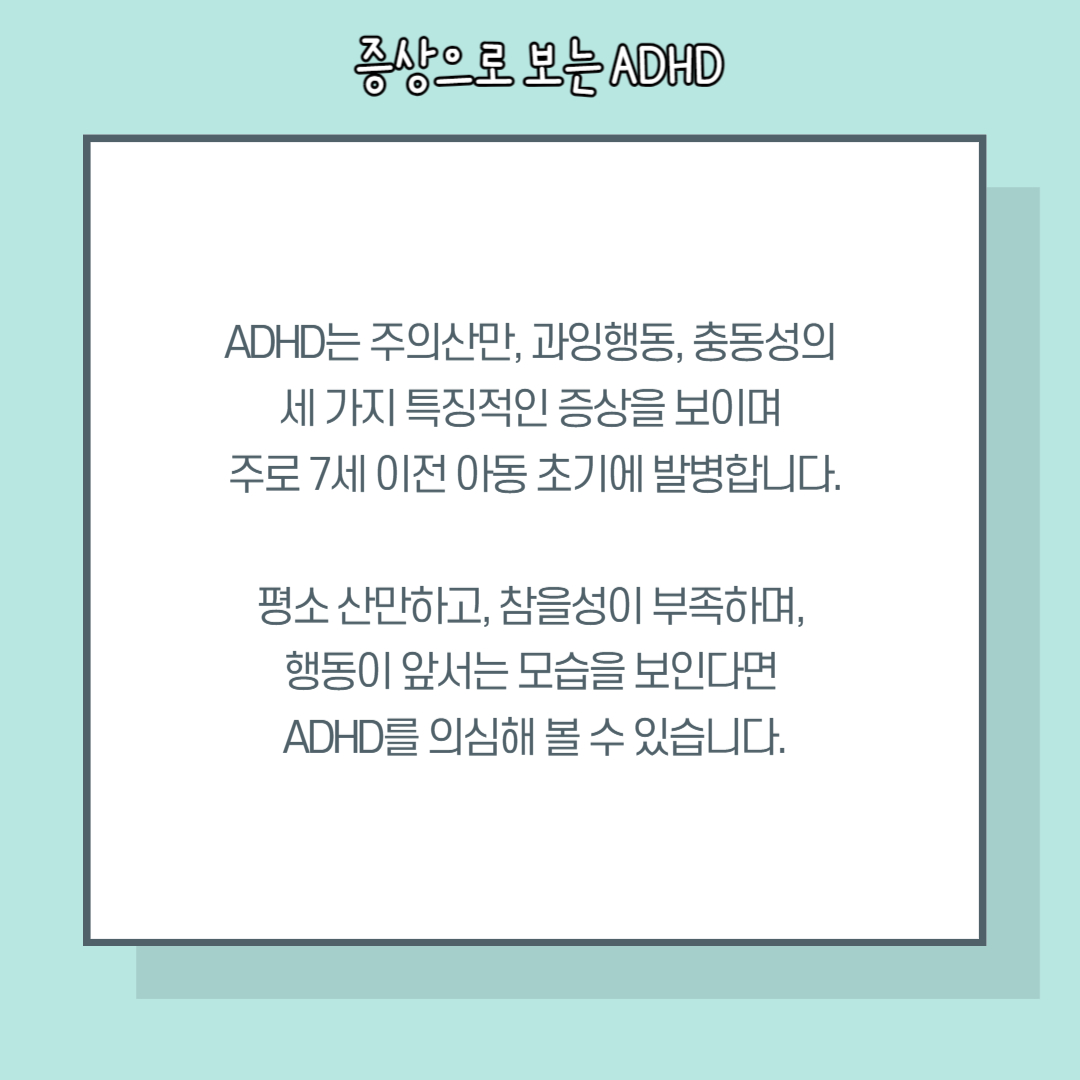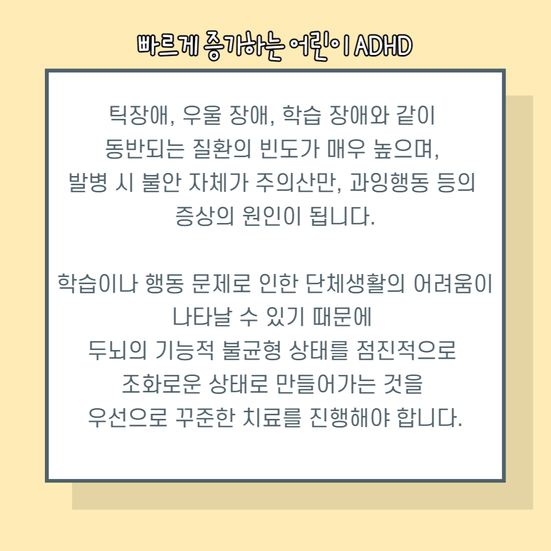 ADHD는 경우에 따라 틱 증상이 동반되며 심리적인 문제로 확장될 수 있어 적극적인 예방과 빠른 치료가 필요합니다.