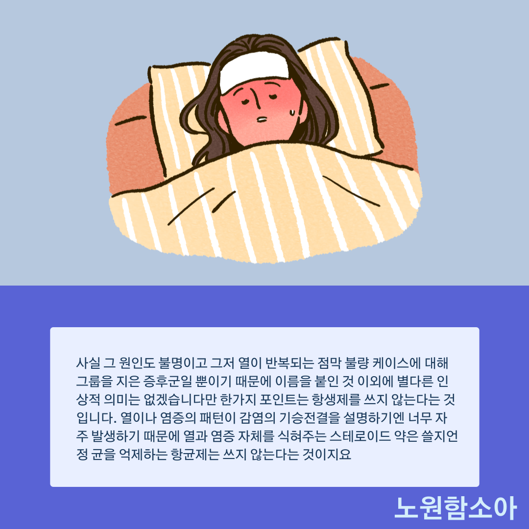 사실 원인 또한 알수 없고 그저 열이 반복되는 케이스에 대해 그룹을 지은 증후군일 뿐, 그로인해 이름을 붙인 것 이외에 별다른 인상적 의미는 없겠습니다. 한가지 포인트는 항생제를 쓰지 않는다는 것인데, 열이나 염증의 패턴이 감염의 기승전결을 설명하기엔 자주 발생하기 때문에 열과 염증 자체를 식혀주는 스테로이드 약은 쓰기는 하지만, 균을 억제하는 항균제는 쓰지 않는다는 것 입니다.