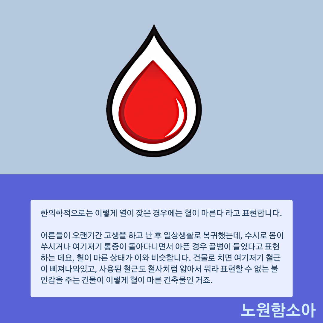 오랜기간 고생을 하고 난 후 일상생활로 복귀하는데, 수시로 몸이 쑤시거나 여기저기 통증에 아픈 경우 골병이 들었다고 표현하는 데, 혈이 마른 상태가 이와 비슷합니다. 건물로 치면 여기저기 철근이 빠져나와있고, 사용된 철근 또한 철사처럼 얇아서 뭐라 표현할 수 없는 불안감을 주는 건물이 "혈이 마른 건축물"인 거죠.