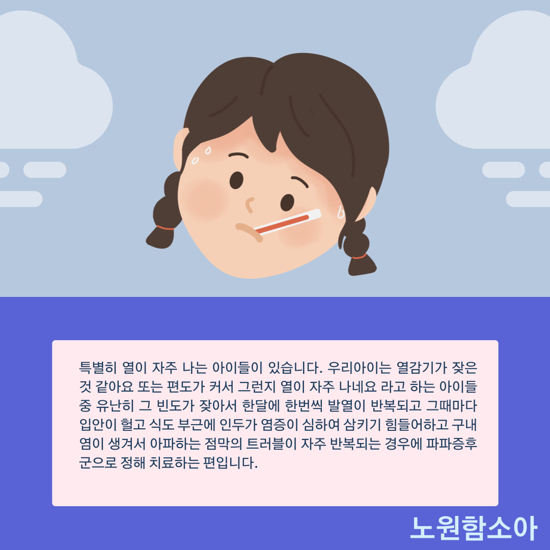 열이 특별히 자주 나는 아이들이 있는데요~ 우리아이는 열감기가 잦아요 또는 편도가 크다고 해서 그런지 열이 자주 나요 라고 하는 아이들 중 그 빈도가 유난히 잦아서 한달에 한번씩 발열이 반복되고, 그때마다 입안도 헐고 식도 부근에 인두가 염증이 심해 삼키기 힘들어하며 구내염이 생겨서 아파하는 점막의 트러블이 자주 반복되는 경우에는 파파증후군으로 정해 치료하는 편입니다.