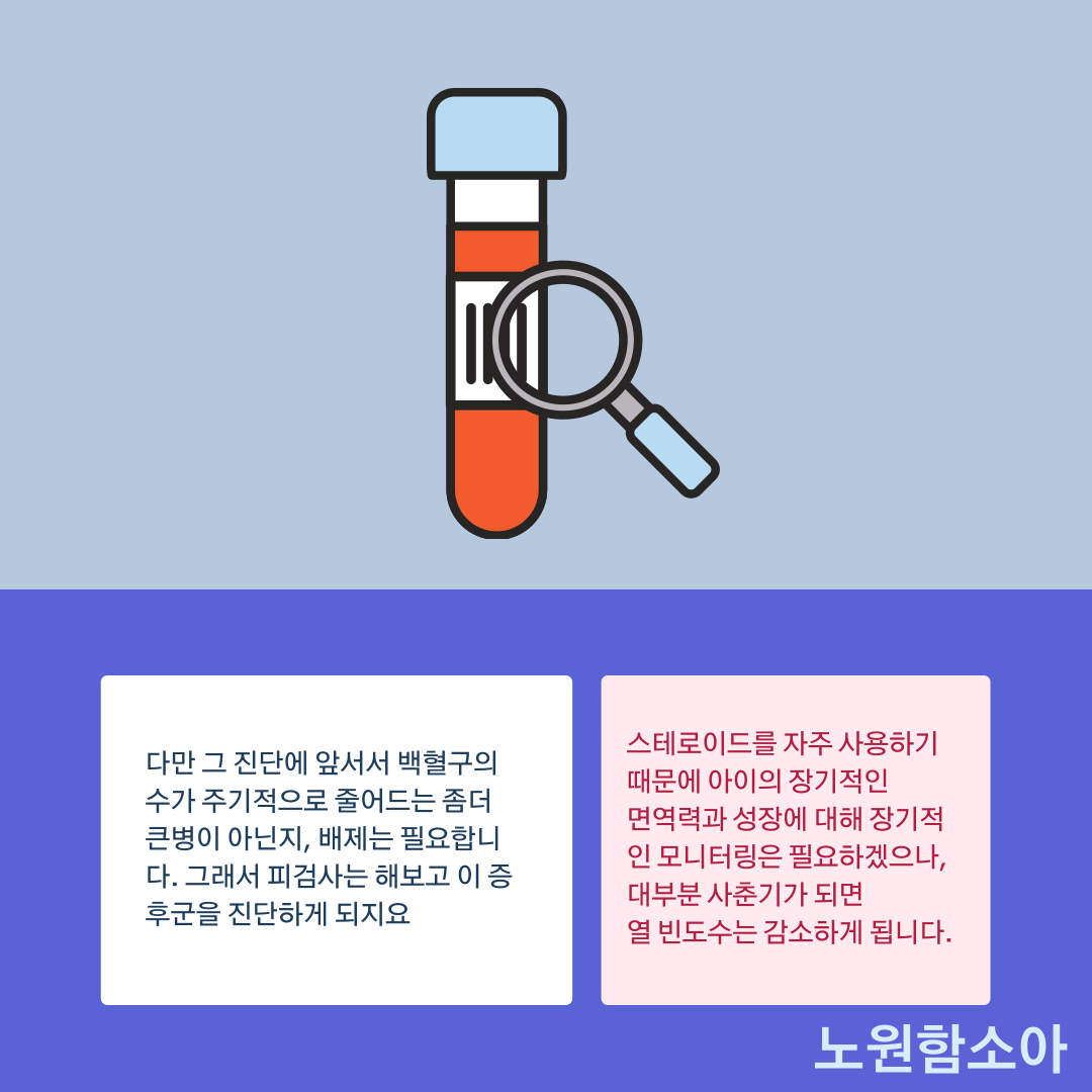 다만 그 진단에 앞서서 백혈구의 수가 주기적으로 줄어드는 더 큰병이 아닌지, 배제는 필요해요. 그래서 피검사는 해보고 이 증후군을 진단하게 됩니다.