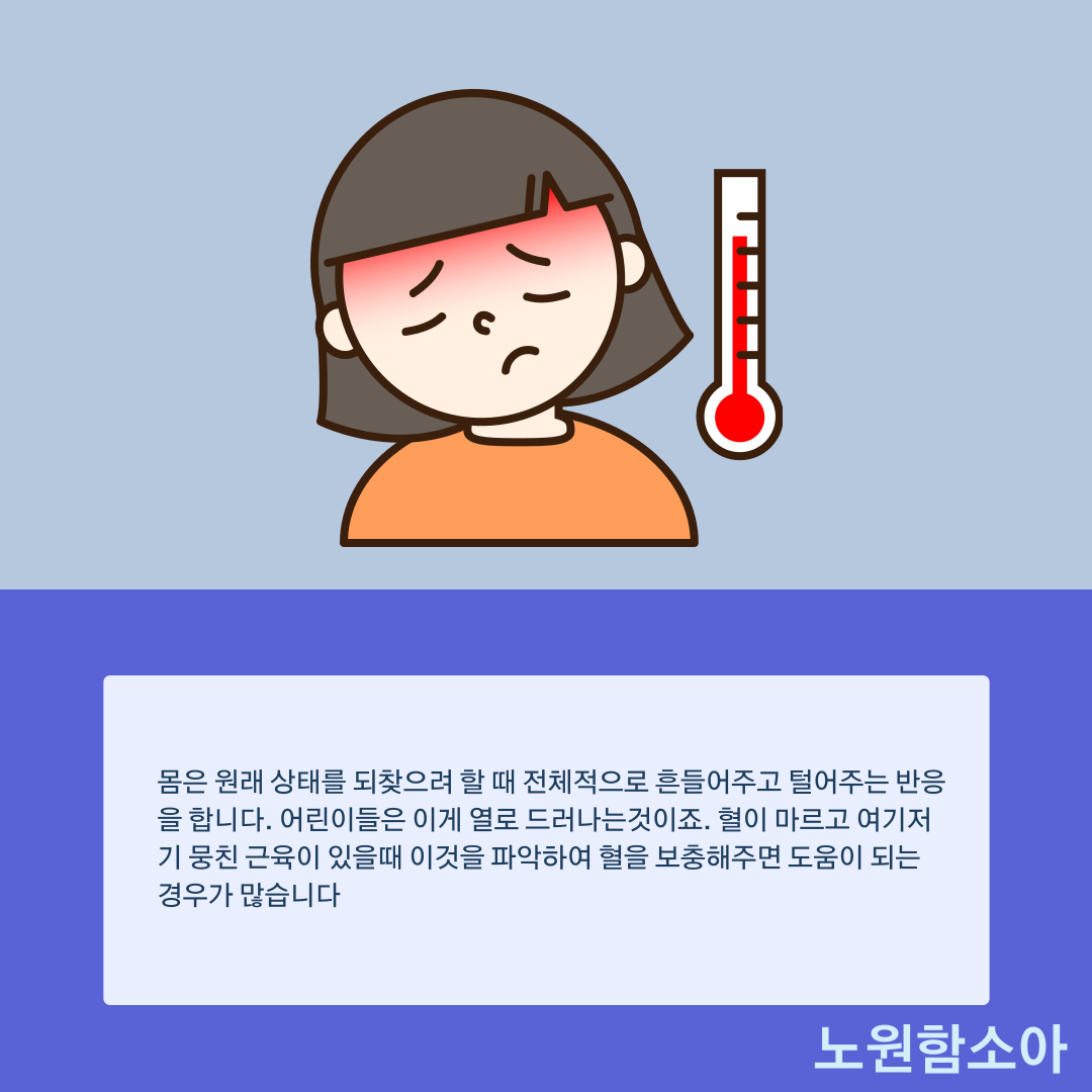 몸은 원래 상태를 되찾으려 할 때 전체적으로 흔들어주고 털어주는 반응을 하는데, 어린이들은 이게 열로 드러납니다.