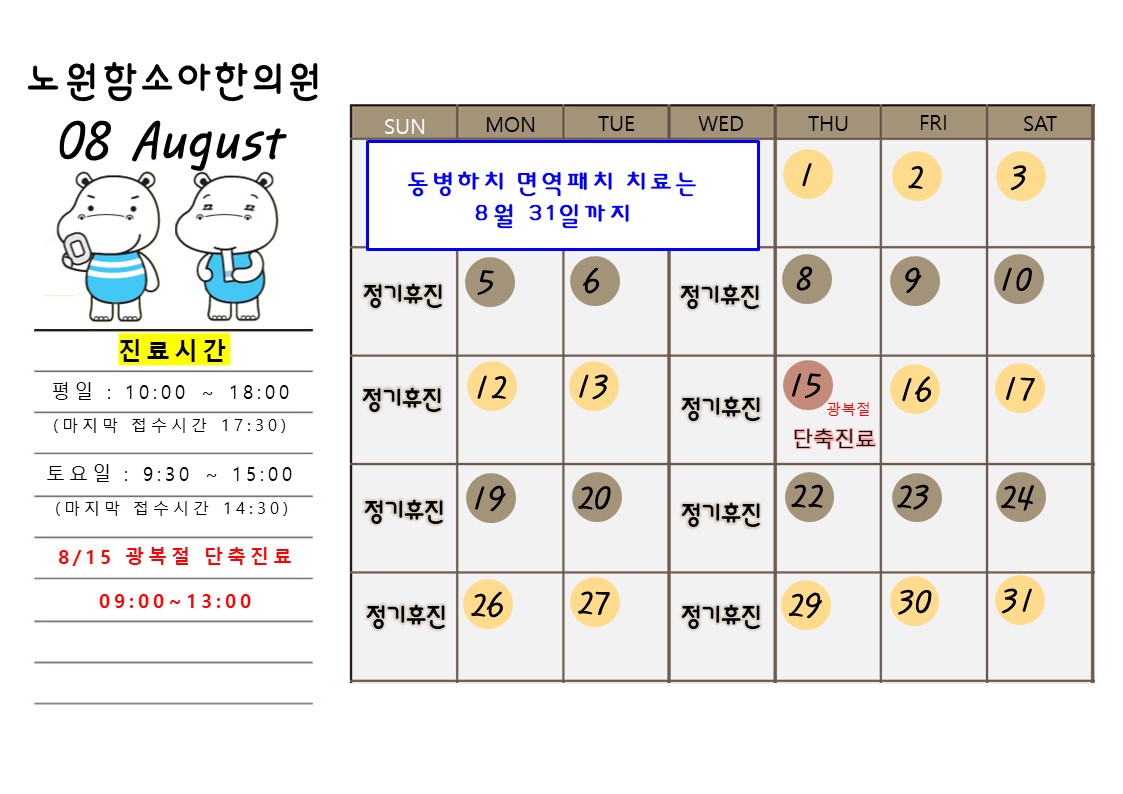 8월 15일 광복절 단축진료 9:00~13:00 (점심시간x)