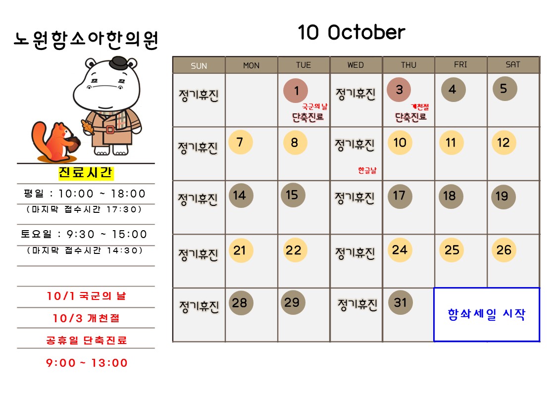 10월 1일 국군의날 , 10월 3일 개천절 단축진료 9:00~13:00 (점심시간x)