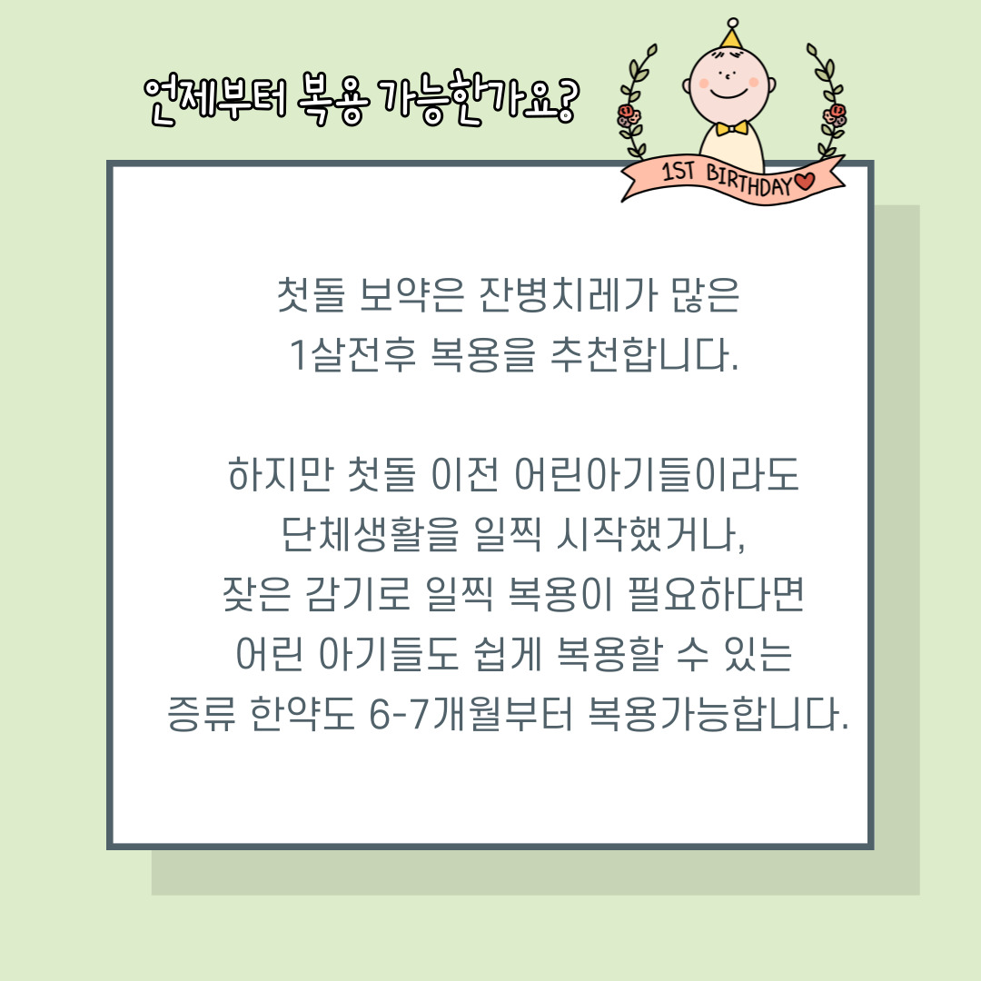 첫돌보약은 엄마에게 물려받은 면역력이 약해지기 시작하는 6개월 이후부터 복용이 가능합니다. 함소아에서는 이유식 단계나 아이의 증상, 체질별 소화기능을 고려해 원장님의 꼼꼼한 진료 후 첫돌보약을 처방 받으실 수 있어요