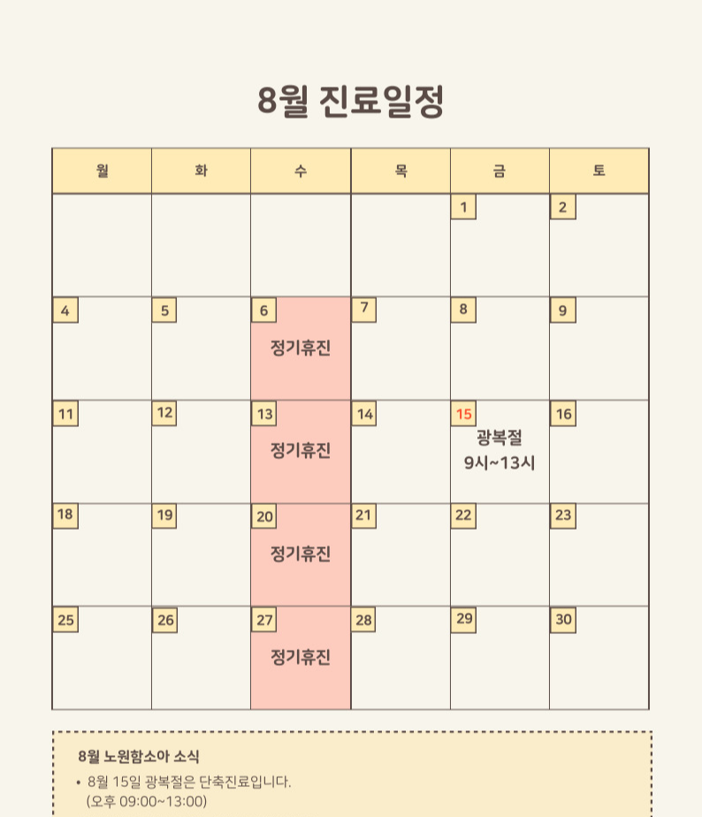 8월 15일 광복절은 단축진료로 9시부터 1시까지만 진료 있습니다.