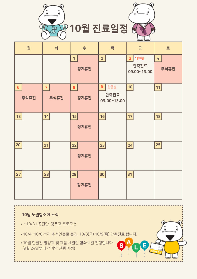 안녕하세요 노원함소아입니다. 연휴가 많은 10월 진료일정 미리 안내드립니다.