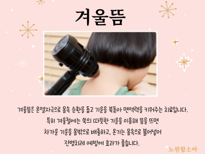 노원함소아에서 진행하는 겨울뜸 프로그램은 따뜻한 온기를 활용해 아이들의 몸을 포근하게 데워주는 계절 맞춤 관리입니다.