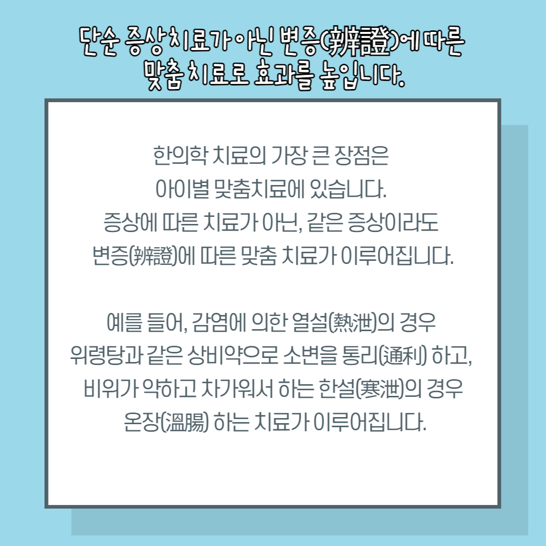 [노원함소아] 장염,설사 장에 걸리는 감기로 치료가 꼭 필요합니다. 노원함소아 장염/ 설사 치료프로그램 * 맞춤한약, 시럽한약 등은 한의사의 진단 후 처방이 필요합니다. * 치료 프로그램은 개인 체질에 따라 부작용이 발생할 수 있으니 주치의 한의사 진료 및 상담 후 진행이 필요합니다. 진료과목 2024.04.16