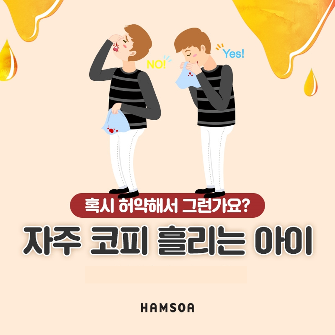 안녕하세요 함소아한의원 노원점입니다 조금만 코를 건드려도, 혹은 건드리지 않아도 코피가 잘 나는 아이들이 있습니다. 혹은 자다가 코피를 흘려 베개를 붉게 적시기도 합니다 오늘은 코피 자주 흘리는 아이, 왜 그런 건지 알아보려고 합니다. 자주 코피가 나는 아이 #코피는 어디서 나는 걸까요? 아이들이 흘리는 코피의 대부분은 안쪽 1cm 정도 부근에서 발생하는 전방 비출혈입니다. ‘카셀바흐’ 영역이라고 하는 이 부위에는 모세혈관이 밀집되어 있고, 층이 얇은 점막으로 되어 있어, 작은 충격이나 자극에도 쉽게 손상되어 출혈이 발생하기 쉽습니다. 자주 코피가 나는 아이 #유독 아이들이 코피를 자주 흘리는 이유1 허약한 아이들뿐만 아니라 튼튼한 아이들도 코피가 날 수 있습니다. 속열이 너무 많아지면 그 열을 식히기 ..