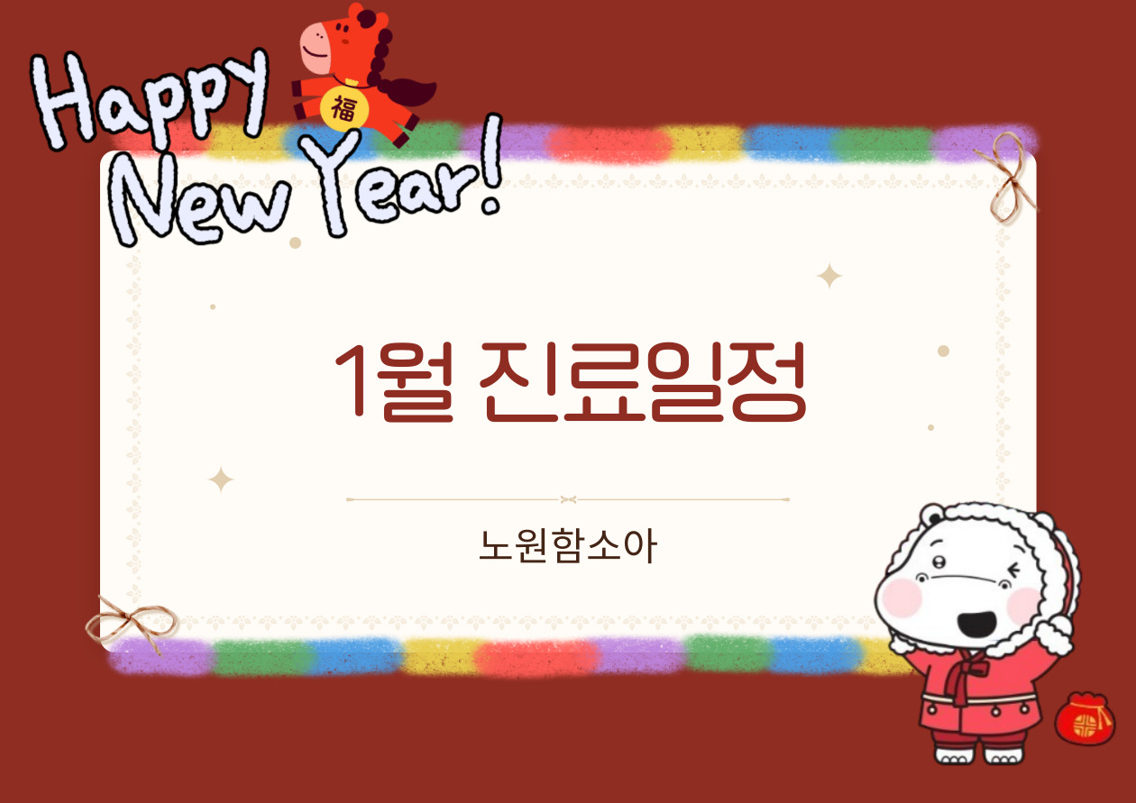 안녕하세요 노원함소아입니다. 벌써 곧 1월이네요^^ 곧있을 새해 1월 일정 미리 안내해드려요 12/31, 1/1, 1/15 휴진이니 참고해주세요 평일 (월,화,목,금) 10시-18시 (점심시간 12:30-2시) 토 9시-13시 (점심시간x) 공휴일( 3일,9일) 9시-13시 (점심시간x) 문의사항은 ☎02-932-0600 또는 댓글로 문의 주세요