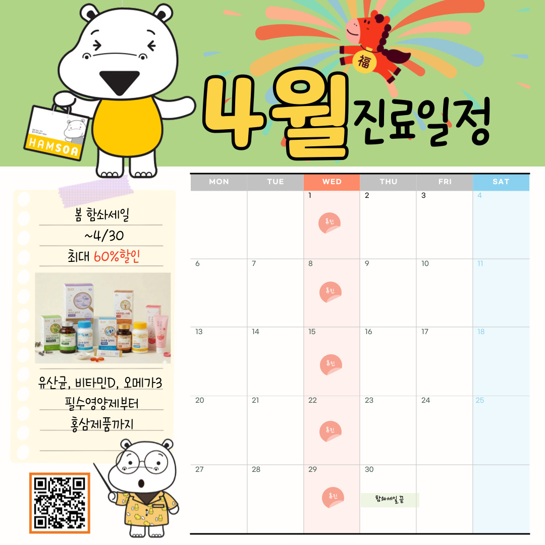 안녕하세요 노원함소아입니다.4월 진료일정안내드립니다. 평일(월화목금) 10-18시(점심시간 12:30~14:00) 토 9시-15시 (점심시간x) 수,일 정기휴진일 문의사항은 02-932-0600 또는 댓글로 남겨주세요