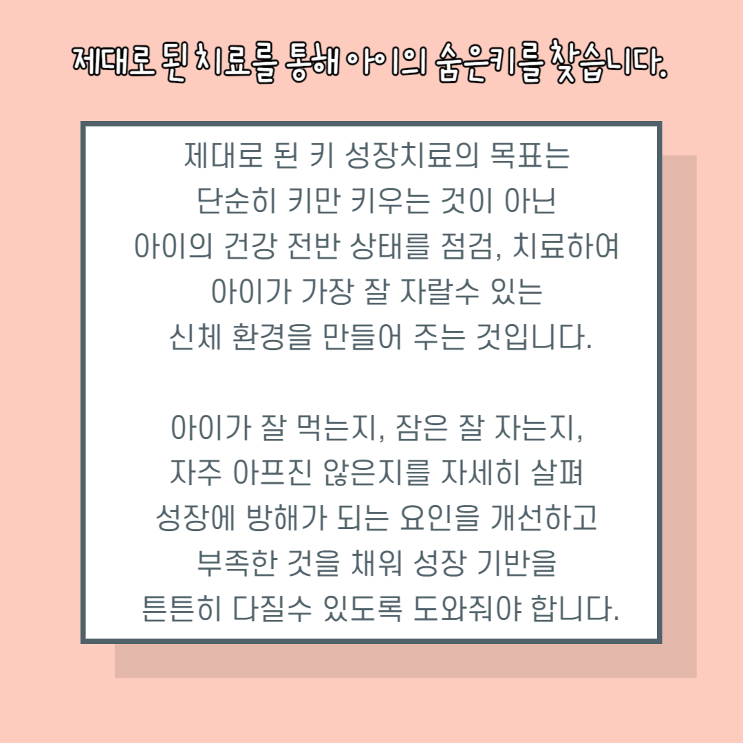[노원함소아] 성장 노원함소아 키성장. 성장판 열려있는 시간은 짧으니까 키 성장 기회를 놓피지 않아야 합니다. 아이 나이와 상태에 맞춰 체계적으로 치료합니다. 노원함소아 키성장프로그램 * 맞춤한약, 시럽한약 등은 한의사의 진단 후 처방이 필요합니다. * 치료 프로그램은 개인 체질에 따라 부작용이 발생할 수 있으니 주치의 한의사 진료 및 상담 후 진행이 필요합니다. 진료과목 2024.04.16