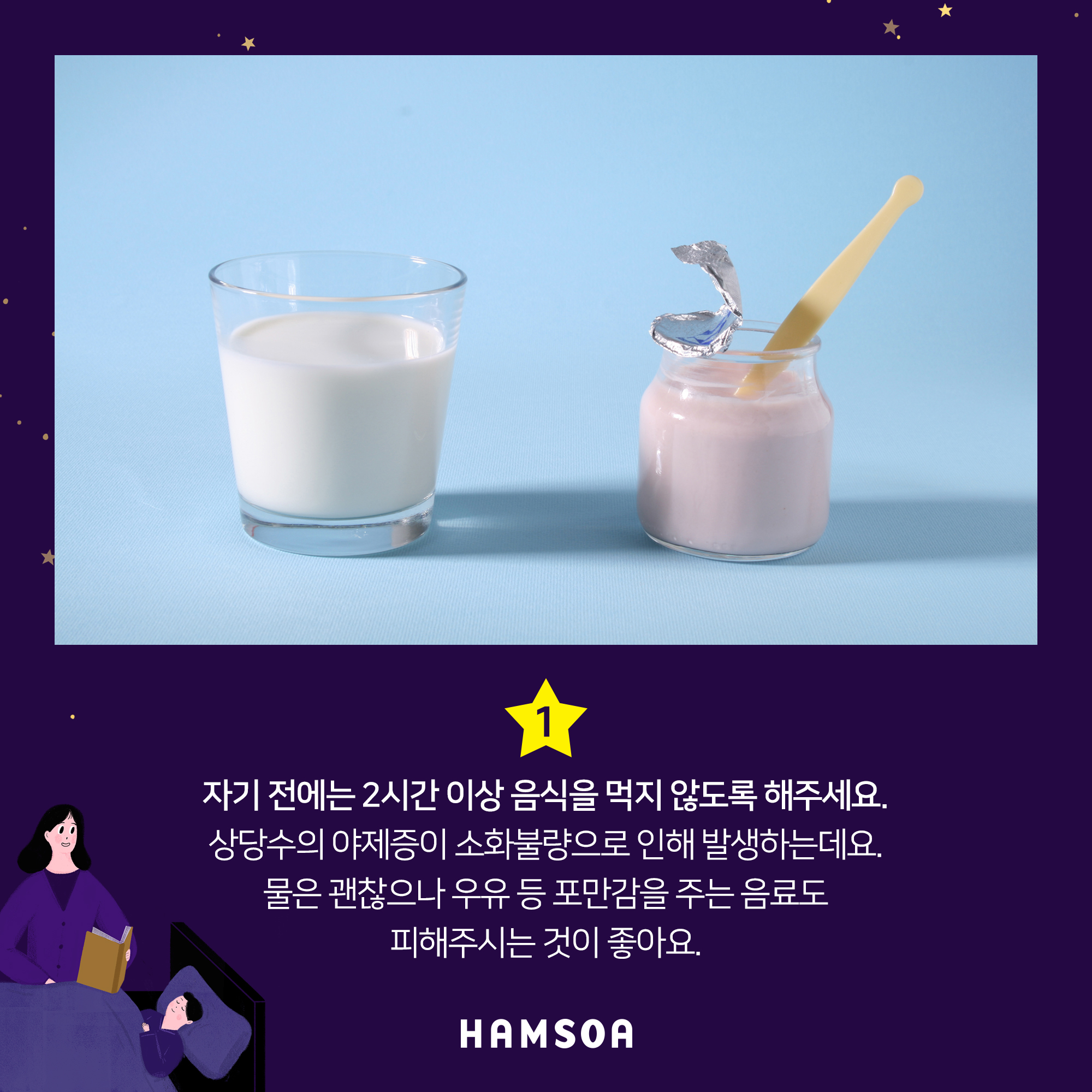 숙면을 위한 생활관리법 #1. 자기 전에는 2시간 전부터는 음식을 먹지 않도록 해주세요.