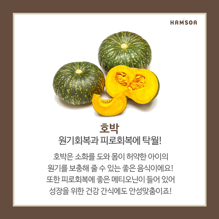 호박은 소화를 도와 몸이 허약한 아이의 원기를 보충해줄 수 있는 좋은 음식입니다.