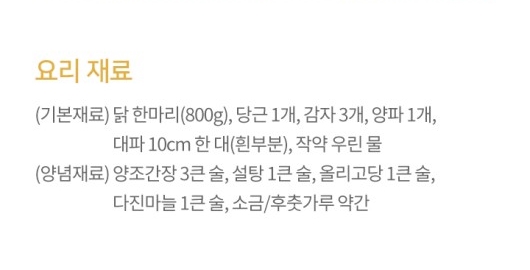 (기본재료) 닭 한마리(800g), 당근 1개, 감자 3개, 양파 1개, 대파 10cm 한대(흰부분), 작약 우린 물
