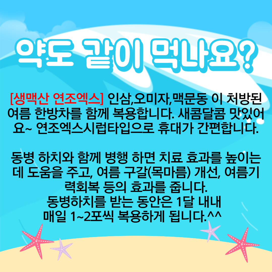 인삼, 오미자, 맥문동이 처방되어있어 여름철 갈증 개선과 가라앉은 기운을 다시 살아나게 해줍니다.^^
