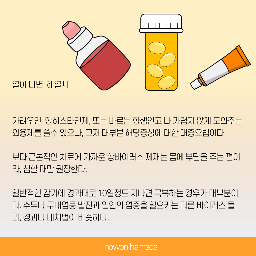 아이가 열이 나면 해열제, 가려우면 항히스타민제 바르는 항생연고 또는 가렵지 않게 해주는 외용제를 쓸수는 있지만, 그저 대부분 해당 증상에 대한 대증요법이다. 좀더 근본적인 치료에 가까운 항바이러스 제재는 몸에 부담을 주는 편이기 때문에 심할 때만 소량 사용을 권장한다. 일반적인 감기는 경과대로 10일 정도 지나면 스스로 극복하는 경우가 대부분인데, 수두 구내염 등 발진과 입안에 염증이 생기는 다른 바이러스들도 경과나 대처법은 비슷하다.