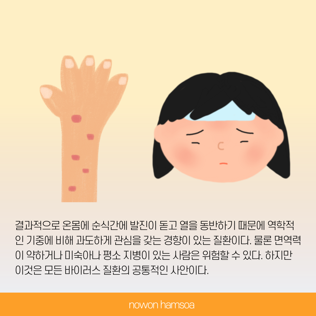 온몸에 발진이 생기며 열이 나기 떄문에 과도하게 관심이 생기는 수족구. 물론 면역력이 약하거나, 평소 지병이 있는 사람이라면 위험할 수 있지만 이것은 모든 바이러스 질환의 공통적인 사안이다.