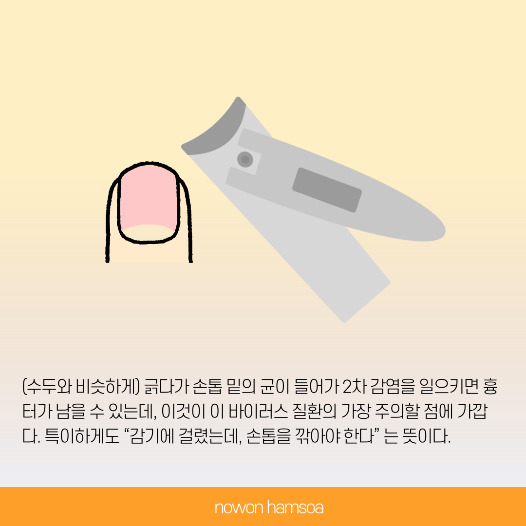 수족구는 긁다가 손톱 밑의 균이 들어가 2차 감염이 생기면 흉터가 남을 수 있는데, 이 부분이 수족구 질환에서 가장 주의할 점에 가깝다. 특이하게도 감기에 걸렸지만, 손톱을 신경써서 관리해야한다는 뜻이다.