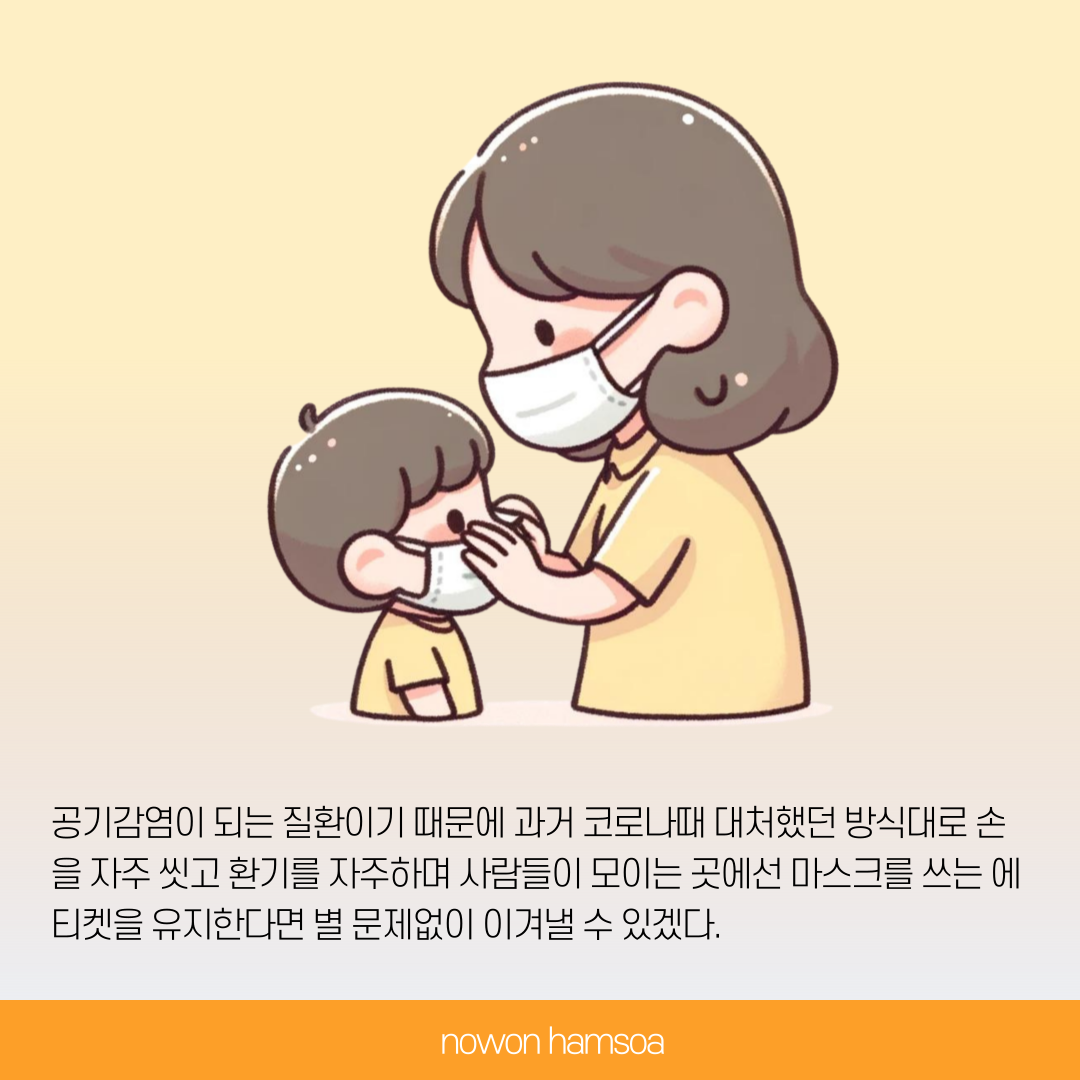 수족구는 공기감염이 되는 질환이기 때문에 코로나때 대처했던 것처럼 손을 자주 씻어야 하고, 환기도 자주해야하며, 사람들이 많이 모이는 장소에선 마스크를 꼭 써야한다.