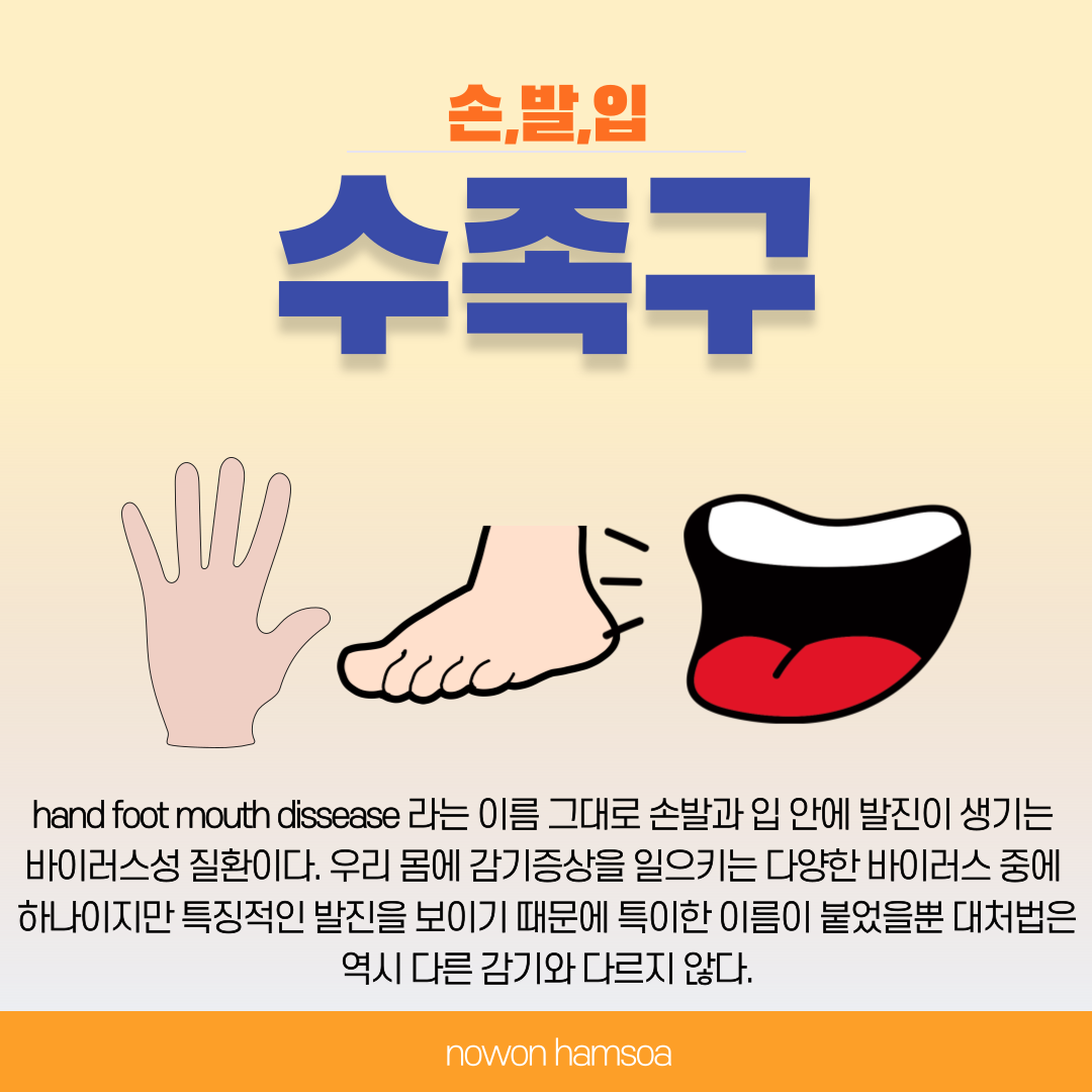 [노원함소아] 손 발 입 수족구!! 수족구는 (hand food mouth dissease) 손발입, 이라는 이름 그대로 손 그리고 발 입안에 발진이 생기는 바이러스성질환이다. 감기증상을 우리몸에 일으키는 많은 바이러스 중 하나지만, 특징적으로 발진을 동반하기 때문에 이름이 붙었을 뿐 대처법은 다른 감기와 다르지 않다. 대부분 수족구는 열로 시작하며, 열이 식은 이후에 3일 정도 지나면 전염력은 없어진다. 그러므로 겉으로 보기에 발진 또는 수포가 남아 있더라도 단체생활을 재개할 수는 있지만, 사회적 인식 그리고 문제상 발진이 모두 사라 진 후 단체생활을 재개하는게 에티켓이긴 하다. 수족구 바이러스 자체는 변형이 자주 일어나는 편이라, 예방접종은 별로 효과를 발휘하지 못하며, 아이들 같은 경우 입안에 발진이 생기면 입안이 헐면서 아프기.. 생생한 질환 정보 2024.06.28